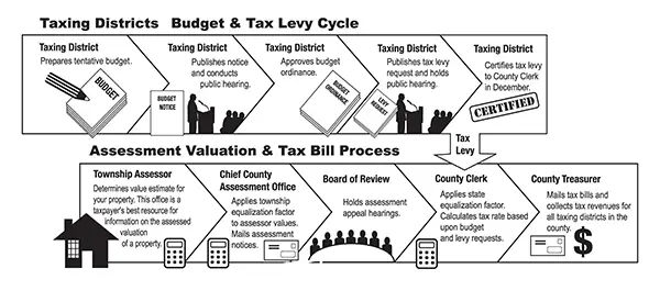 Taxation: Taxes are the result of the monies needed to operate each unit of government shown on your tax bill (county, cities, township, school districts, fire protection districts, library districts, etc.). These units of government levy their needed monies by certification to the County Clerk toward the end of each calendar year. These levy amounts are converted to a tax rate based on the amount of taxable assessed value within the respective taxing district.